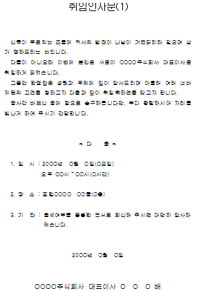 다름이 아니오라 이번에 본인은 새로이 OOOO주식회사 대표이사로 취임하게 되었습니다.