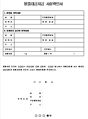 물품대금지급 사실확인서 양식 2019-07-16 by sugar 물품대금지급 사실확인서.hwp 0.02MB 물품대금 지급인 ○○○이 20○○년 ○월 ○일에 ○○○ 장소에서 물품대금을 상기 동업자 ○○○에게 물품대금을 지급한 사실이 틀림없음 을 확인합니다.