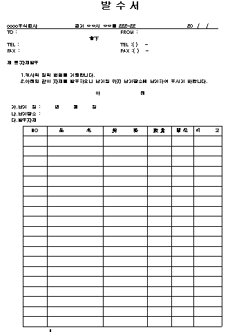 자재 발주서 양식 (회사, 기업) 2019-07-17 by sugar 발주서v0.1.hwp 0.02MB 제 목:자재발주 1.귀사의 일익 번영을 기원합니다. 2.아래와 같이 자재를 발주하오니 납기일 까지 납기장소에 납기하여 주시기 바랍니다.