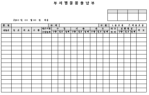 부서별 물품 출납부 양식 2019-07-19 by sugar 부서별 물품출납부.hwp 0.03MB 품명 규격 구분 1. 감가성 2. 비감가성 취급자 일자 적요 수량 전기이월 수정금액 수입 지출 재고 재고 위치 납품반납 비고 수량 단가 금액 수량 단가 금액 수량 단가 금액 수량 단가 금액