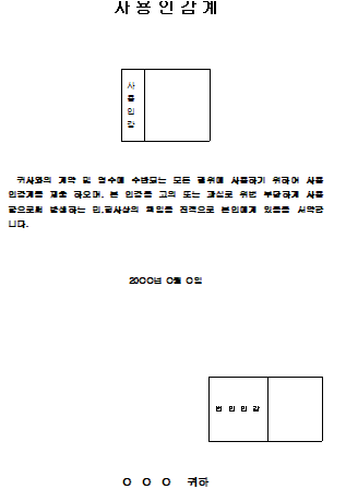 사용 인감계 양식 2019-07-23 by sugar 사용인감계2.hwp 0.02MB 귀사와의 계약 및 영수에 수반되는 모든 행위에 사용하기 위하여 사용 인감계를 제출 하오며, 본 인감을 고의 또는 과실로 위법 부당하게 사용 함으로써 발생하는 민,형사상의 책임을 전적으로 본인에게 있음을 서약합니다.