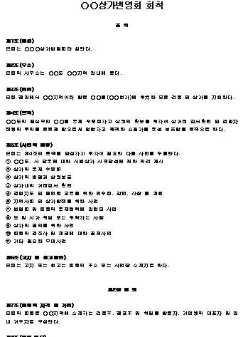 ○○도의 중심부인 ○○를 국제 수준화하고 상권의 확보를 위하여 상거래 질서확립 및 경영자 전체의 우의를 돈독케 함으로써 명랑하고 쾌적한 쇼핑가를 육성 보존함을 목적으로 한다.