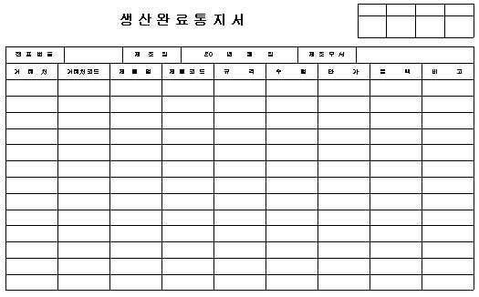생산완료 통지서 양식 2019-07-25 by sugar 생산완료통지서.hwp 0.02MB 전표번호 제조일 20 년 월 일 제조부서 거래처 거래처코드 제품명 제품코드 규격 수량 단가 금액 비고