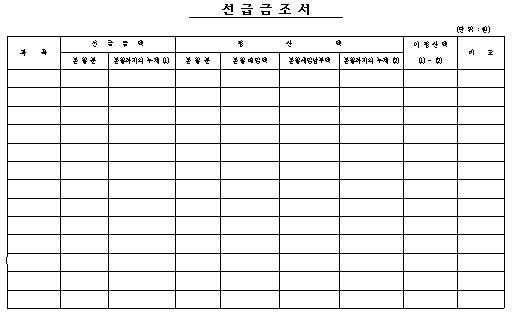 선급금액 정산액 미정산액 본월까지의 누계 (1) 본월예입액 본월세입납부액 본월까지의 누계 (2)