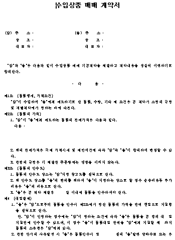 “갑”이 수입하여 “을”에게 매도하기로 한 물품, 수량, 기타 제 조건은 본 계약서 소정의 규정 및 개별계약에서 정하는 바에 따른다.