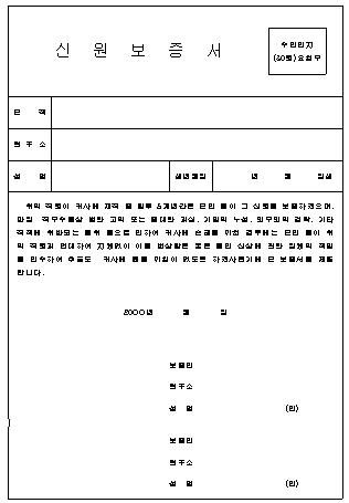 위의 직원이 귀사에 재직 중 향후 5개년간은 본인 등이 그 신원을 보증하겠으며, 만일 직무수행상 범한 고의 또는 중대한 과실, 기밀의 누설, 외부와의 결탁, 기타 직책에 위반되는 행위 등으로 인하여 귀사에 손해를 끼친 경우에는 본인 등이 위의 직원과 연대하여 지체없이 이를 변상함은 물론 동인 신상에 관한 일체의 책임을 인수하여 추호도 귀사에 폐를 끼침이 없도록 하겠사옵기에 본 보증서를 제출합니다.
