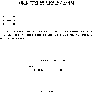 야간, 휴일 및 연장근로 동의서 양식 2019-07-31 by sugar 야간, 휴일 및 연장근로동의서.hwp 0.02MB 본인은 ○○○○에서 2004. 4. 11 시행하는 제14회 신입사원 공개채용시험에 응시함에 있어 본 시험에 합격하여 직원으로 임용될 경우 근로기준법의 규정에 의한 야간, 휴일 및 연장(시간외) 근로에 동의합니다.