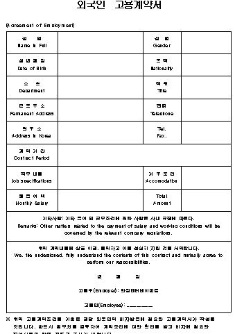 외국인 고용계약서 양식 2019-08-05 by sugar 외국인고용계약서.hwp 0.03MB ※ 위의 고용계약조건을 기초로 해당 외국인의 비자발급에 필요한 고용계약서가 작성될 것입니다. 반드시 총무처를 경유하여 계약조건에 대한 확인을 받고 비자에 필요한 잔여서류와 함께 제출해 주시기 바랍니다.