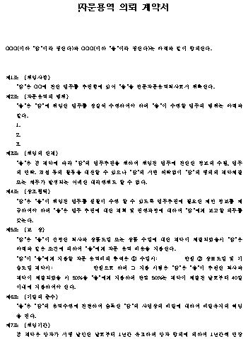 “을”은 본 계약에 따라 “갑”의 업무추진을 위하여 위임된 업무에 관한한 정보의 수집, 업무의 연락. 교섭 등의 활동을 대신할 수 있으나 “갑”의 서면 허락없이 “갑”의 명의의 계약체결 또는 채무가 발생되는 어떠한 대리행위도 할 수 없다.