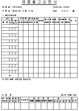 제품출고 요청서 양식 2019-08-16 by sugar 제품출고요청서.hwp 0.03MB P/O No. 요청량 (㎏) 결재방법 도착지 출 고 요청일 운송구분 출고 지시일 지시량(㎏) 단가(원/㎏) 품명 규격 일반 임가공 현금 어음 T W L