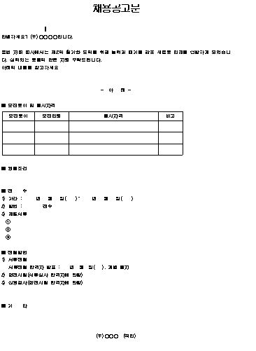 채용 공고문 양식 2019-08-19 by sugar 채용 공고문.hwp 0.02MB 금번 저희 회사에서는 제2의 활기찬 도약을 위해 능력과 패기를 갖춘 새로운 인재를 선발하게 되었습니다. 실력있는 분들의 많은 지원 부탁드립니다.