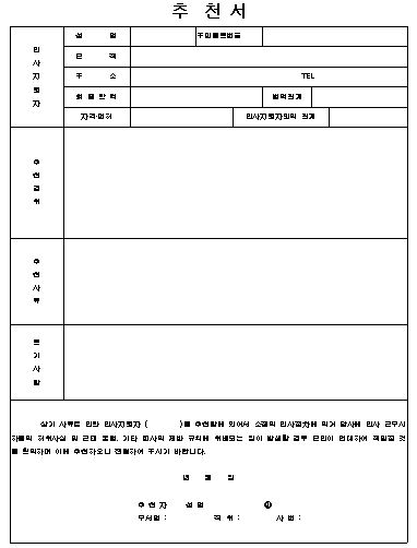 상기 사유로 인한 입사지원자 ( )를 추천함에 있어서 소정의 입사절차에 의거 당사에 입사 근무시 하등의 허위사실 및 근태 불량, 기타 회사의 제반 규칙에 위배되는 일이 발생할 경우 본인이 연대하여 책임질 것을 확약하며 이에 추천하오니 전형하여 주시기 바랍니다.