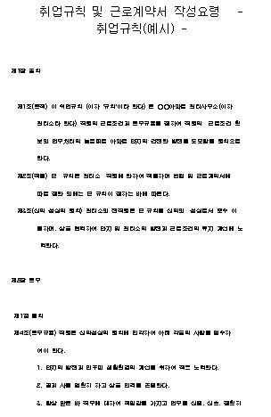 제1조(목적) 이 취업규칙 (이하 ‘규칙’이라 한다) 은 ○○아파트 관리사무소(이하 관리소라 한다) 직원의 근로조건과 복무규율을 정하여 직원의 근로조건 확보와 업무처리의 능률화로 아파트 단지의 건전한 발전을 도모함을 원칙으로 한다.