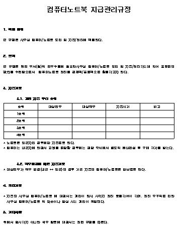 본 규정은 현업 부서(팀)의 업무수행에 필요한사무실 컴퓨터/노트북 도입 및 지급/관리하는데 있어 표준화된 절차를 수립함으로서 컴퓨터노트북 관리를 경제적/효율적으로 활용하고자 한다.