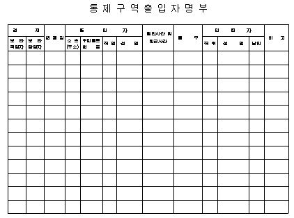 통제구역 출입자 명부 양식 2019-08-21 by sugar 통제구역출입자명부.hwp 0.03MB 결재 년월일 출입자 출입시간 및 퇴근시간 용무 입회자 보안 책임자 보안 담당자 소속 (주소) 주민등록 번호 직명 성명 직위