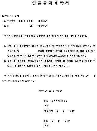 1. 갑은 을의 신주발행의 모집에 관한 정관 및 주식청약서의 기재내용을 승인하고 위 부동산을 금 원으로 환산하여 갑에게 현물출자하기로 하고 을은 갑이 발행하는 신 주식의 보통주식(1주의 금액 0,000원) 00,000주를 부여받기로 한다.