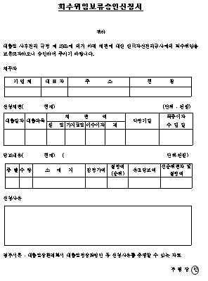 회수 위임 보류 승인 신청서 양식 2019-08-24 by sugar 회수위임보류승인신청서.hwp 0.02MB 대출금 사후관리 규정 제 19조에 의거 아래 채권에 대한 한국자산관리공사에의 회수위임을 보류코자하오니 승인하여 주시기 바랍니다.