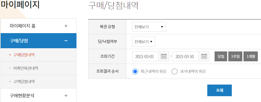 오른쪽 화면에서 조회기간을 선택한 후 조회 버튼을 클릭하면 하단에 구매 및 당첨 내역이 나옵니다.