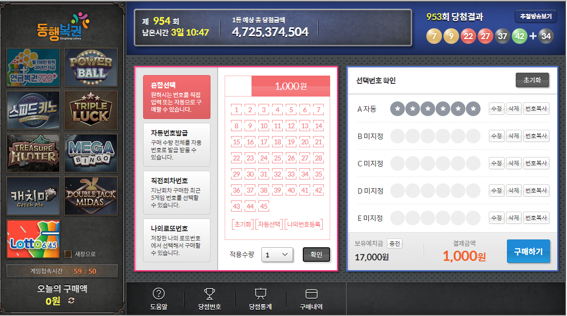 로또 복권을 구매 할 수 있는 창이 열립니다.