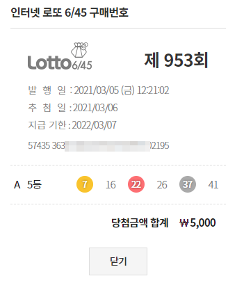 지난주에 복권 두 개를 구입했는데 두 개 다 5등에 당첨되는 행운이 왔습니다. 복권 판매점에서 구매 했을 때는 5등 당첨금도 복권 판매점에 방문해 교환해야 했는데 인터넷으로 구매하니 바로 예치금으로 충전이 됩니다. 예치금은 다시 출금해서 현금화 할 수 있습니다. 충전 버튼 옆에 출금 버튼이 있습니다.