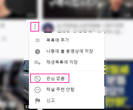 만약 더이상 해당 주제의 영상을 보고 싶지 않을 땐 영상 썸네일 아래에 점 세개 메뉴 버튼을 클릭하면 아래에 “관심 없음” 메뉴가 있습니다. 선택하면 해당 영상과 관련 된 추천 영상은 노출되지 않습니다. 나중에 다시 다른 영상에서 파생 된 주제로 다시 비슷한 주제의 영상이 노출 될 수도 있지만 이 작업을 수시로 하다보면 나중엔 내가 정말 관심있는 영상 위주로 추천 받을 수 있습니다.