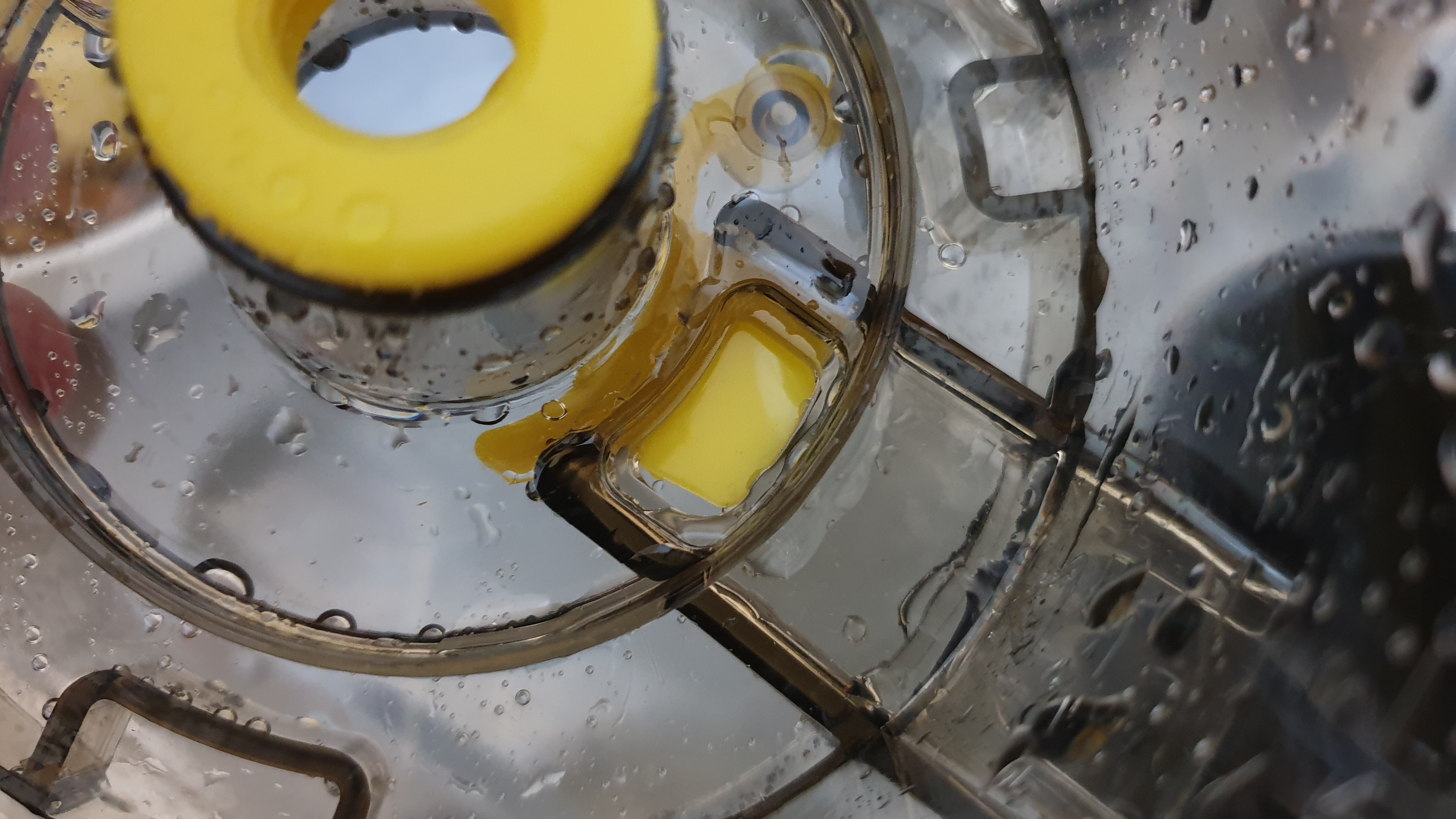 나중에 설거지 할 때 하단 몸통을 뒤집어 보면 노란색 패킹에 찌꺼기가 많이 끼어있는데 뒤로 당기면 빠집니다. 그러면 흐르는 물로 쉽게 씻어낼 수 있습니다.