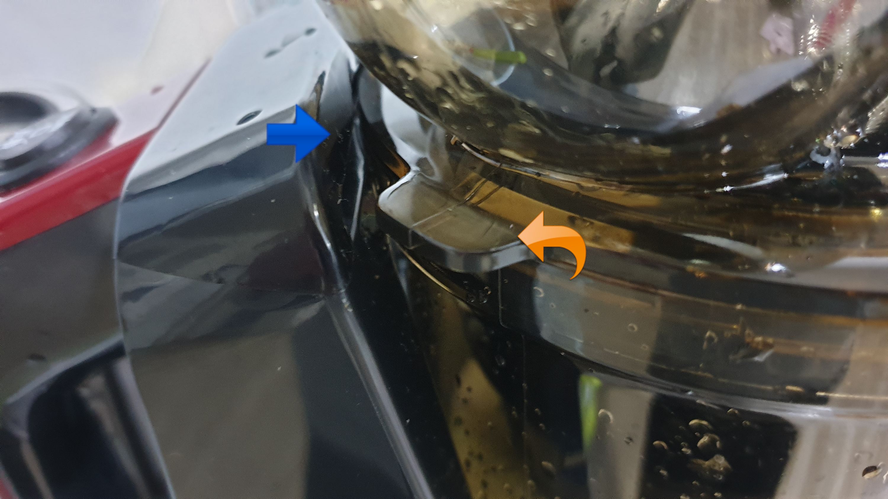 위에 과일 넣는 통을 보면 아래에 돌기가 있습니다. (황색 화살표) 이걸 잘 맞춰서 파란색 화살표가 있는 몸체 안으로 끼워 넣어야 접지가 되서 전기가 통합니다. 즉, 몸체가 일직선이 되게 조립을 잘해야 작동됩니다. 부품마다 홈이나 돌기가 있는데 이유가 다 있습니다.