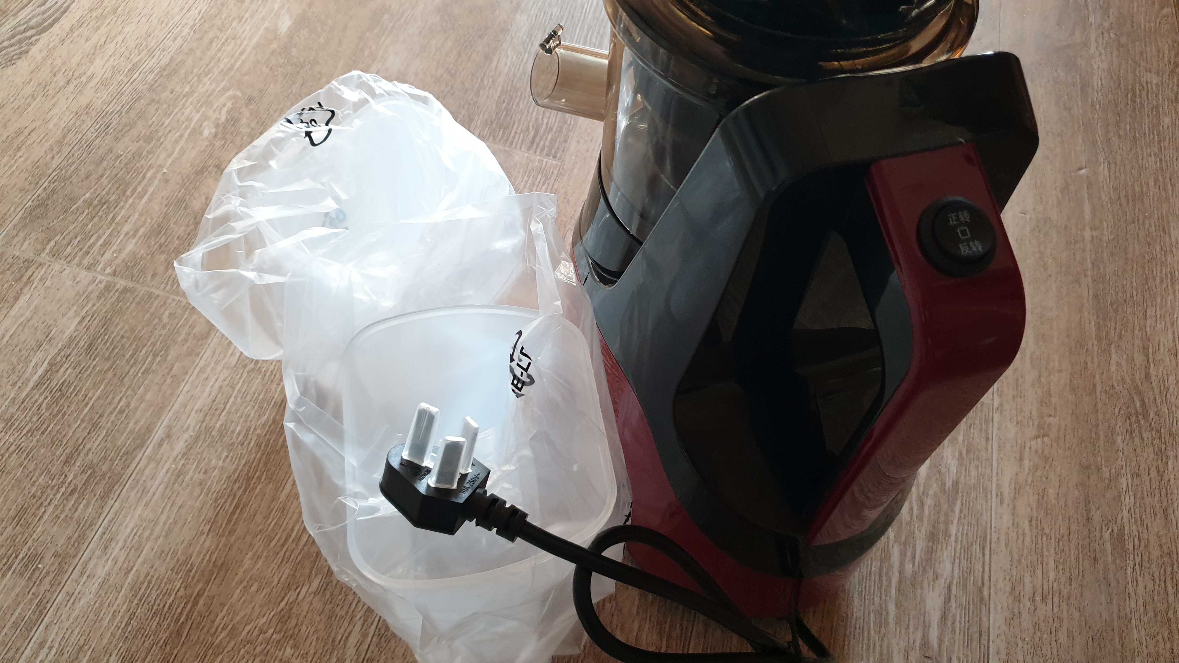 하단 몸통에 과육과 찌꺼기(?)를 걸리내는 통에 노란색 고무 패킹으로 막혀있는 홈이 있습니다. 이 홈을 일직선으로 맞춰줘야 제대로 조립이 됩니다. 과일을 넣는 부분(한문과 ↓화살표 안내문이 있는 쪽)이 스위치 쪽으로 오면 됩니다.