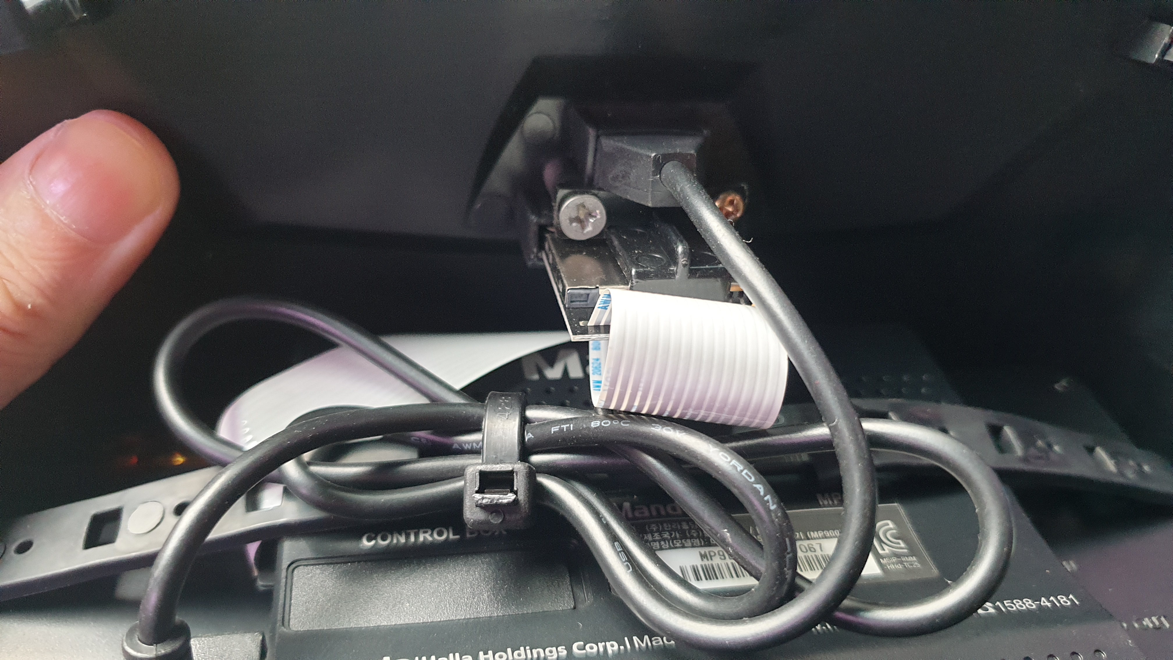 작업을 위해 바깥쪽 마감재까지 분리했습니다. 선 두 개가 보입니다. 왼쪽 노란색 잰더가 붙어있는 건 후방카메라 연결 선입니다. 오른쪽은 파워(전력) 선입니다. 내비에는 일단 이렇게 두 개만 연결하면 사용 가능합니다.